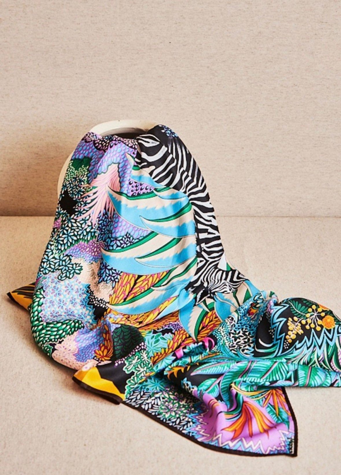 PaƱuelo con original estampado de cebra en colores vivos, que hacen de esta pieza un complemento perfecto para aportar una nota de color a culquier look otoƱal.