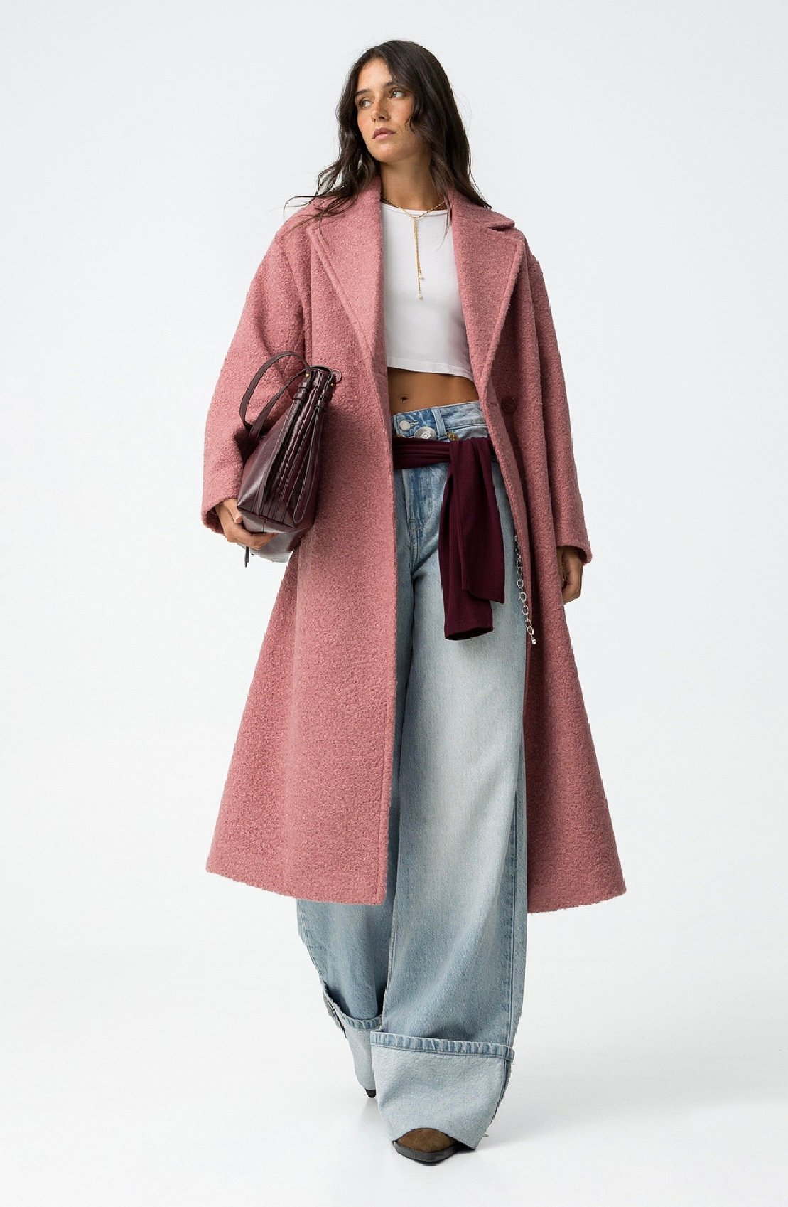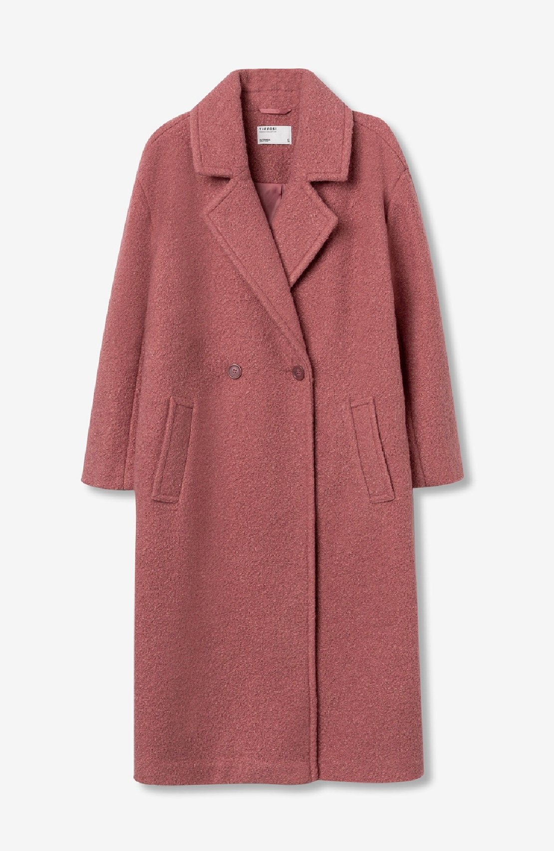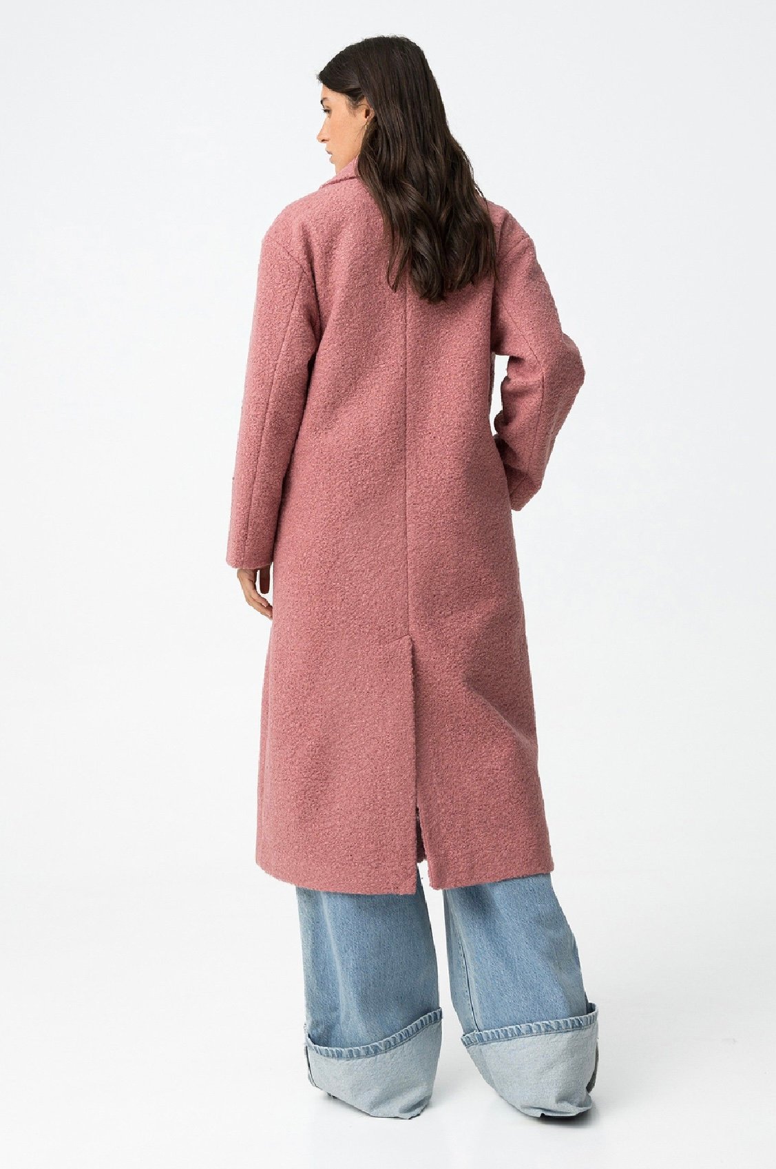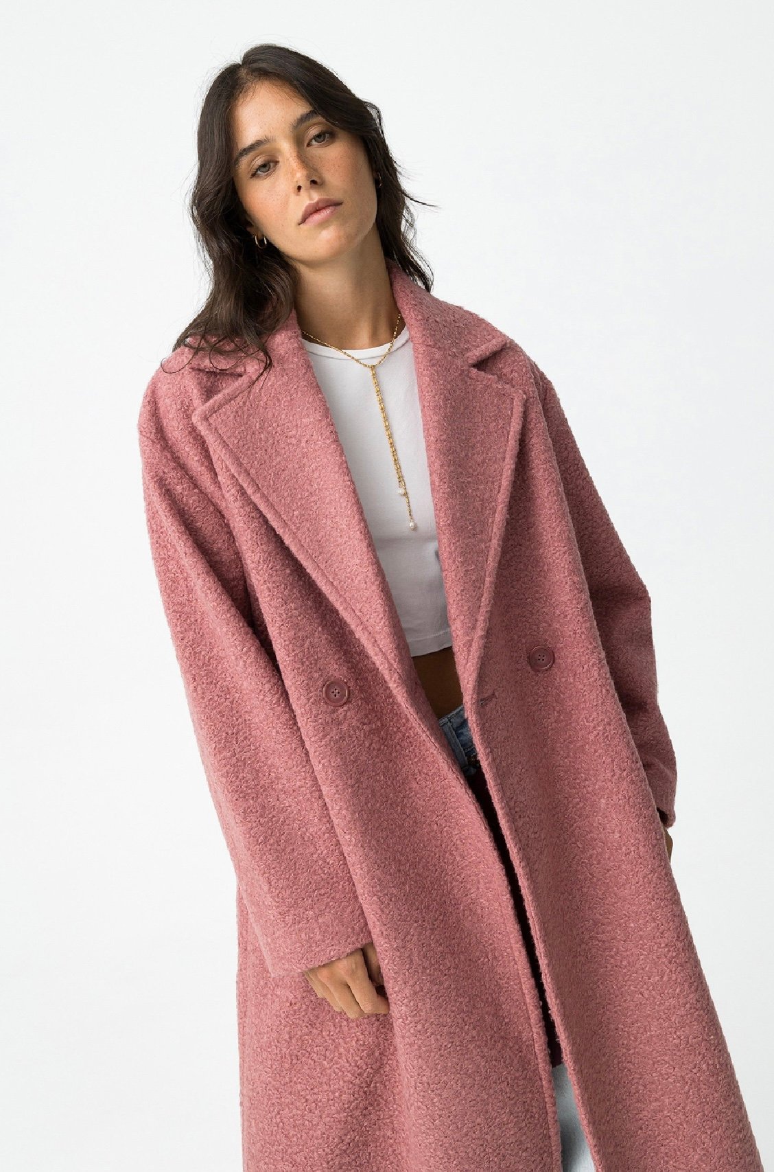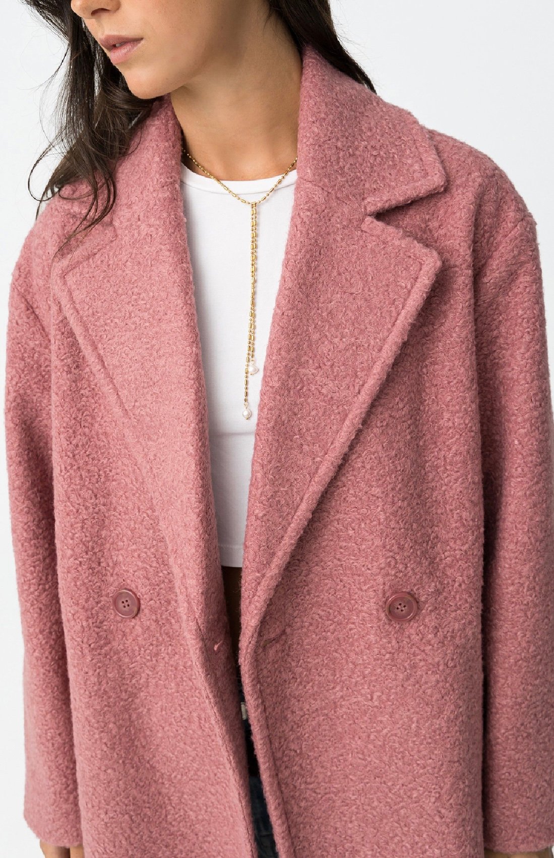 Abrigo largo de corte relaxed en bouclé, con dos bolsillos frontales, doble cruce y cierre de botón. Solapa notch y manga larga.