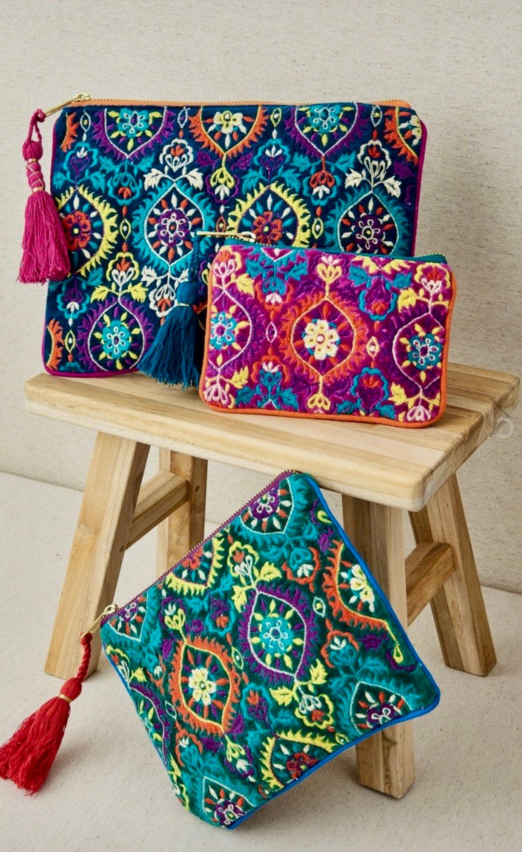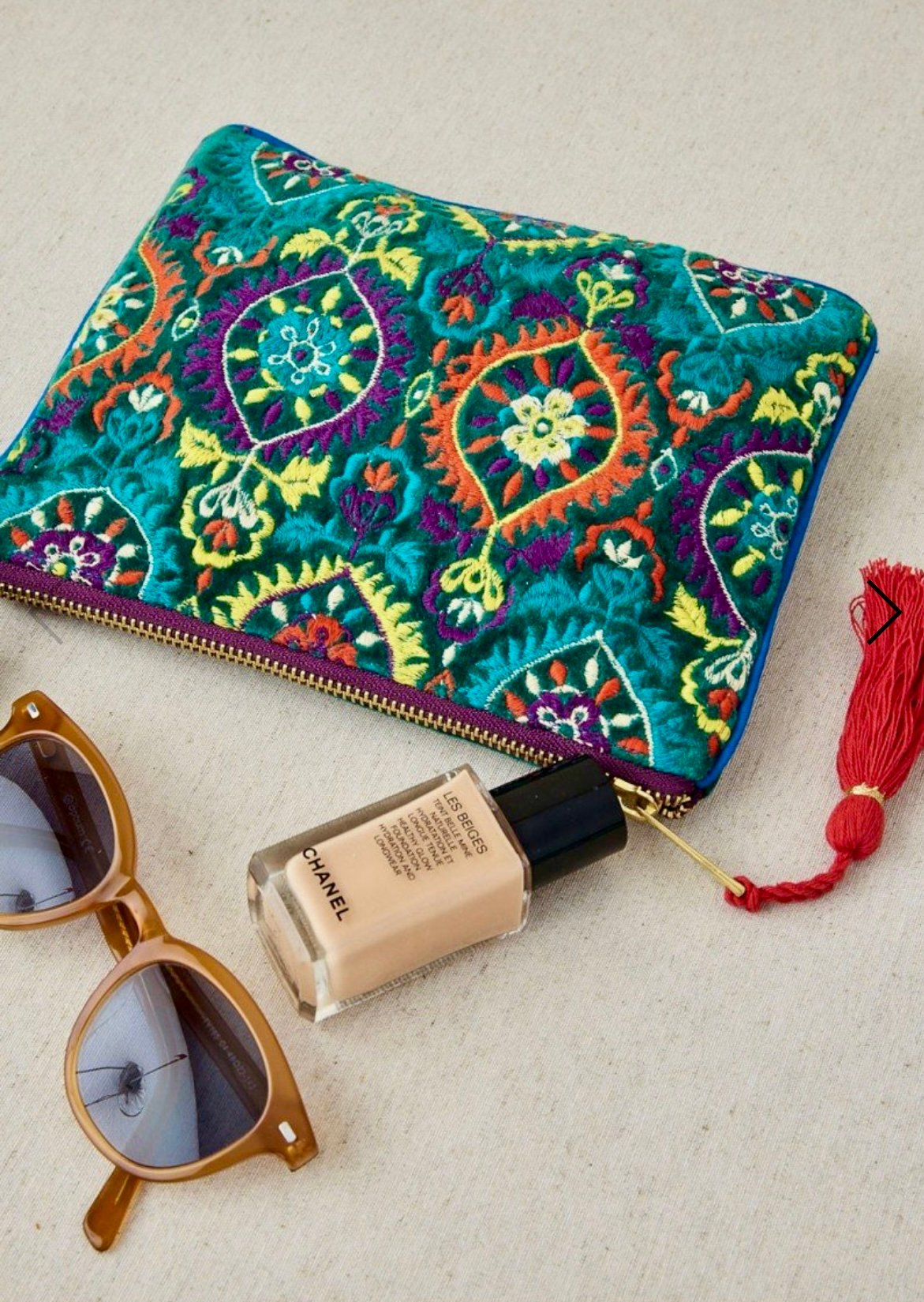 Bolsita mediana de terciopelo verde con bordado floral en colores intensos. Un accesorio llamativo para llevar maquillaje, gafas o pequeños esenciales en tu bolso de invierno.