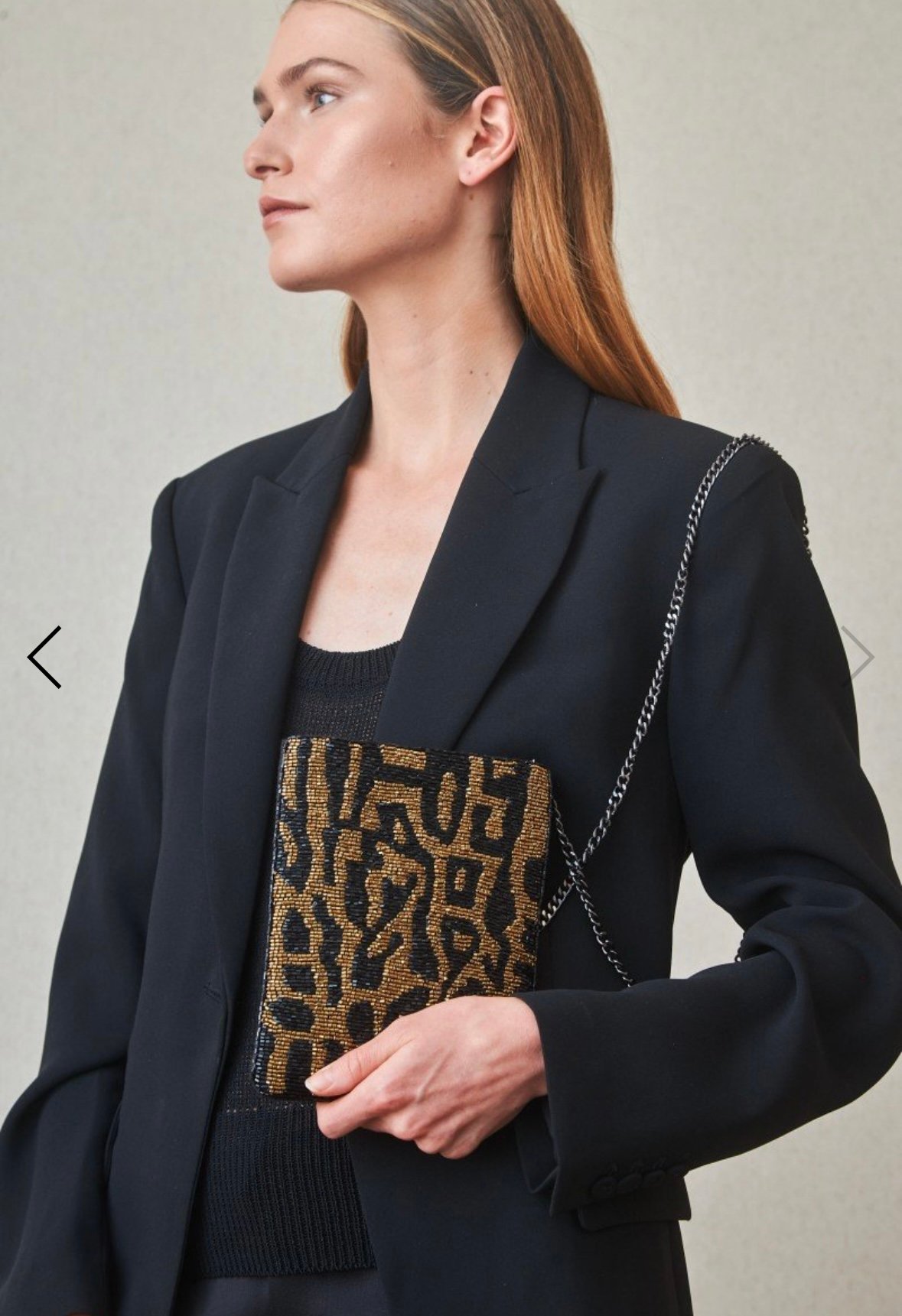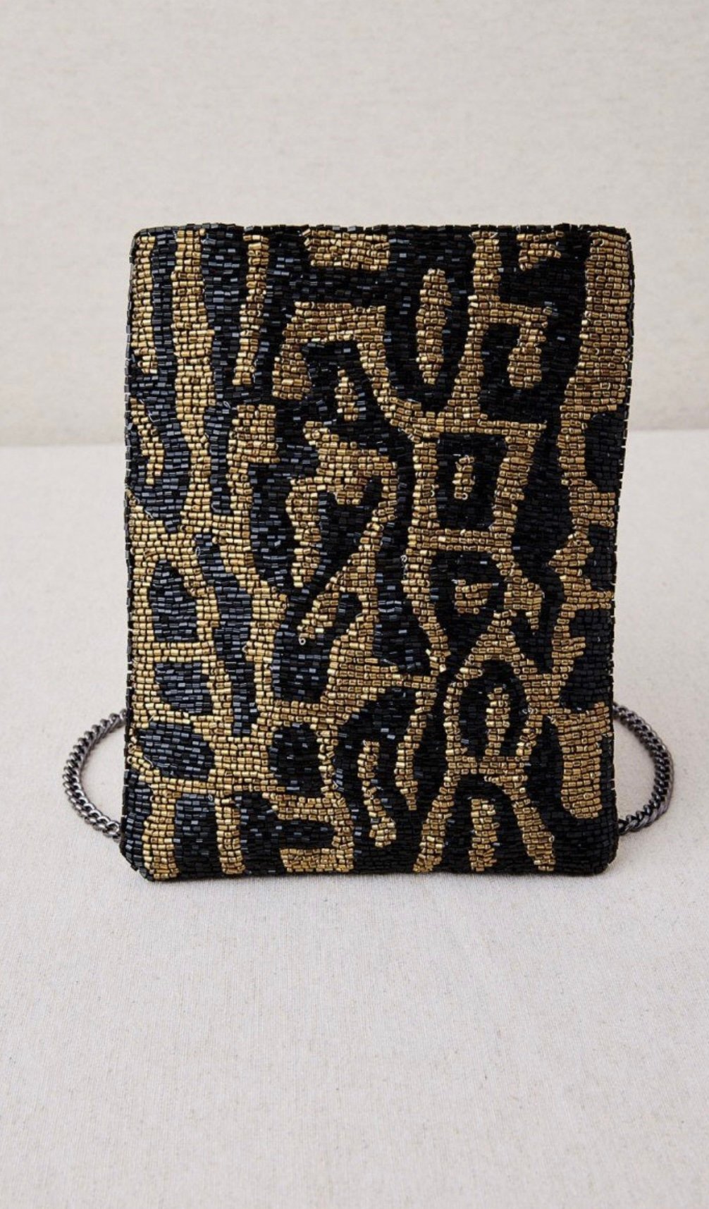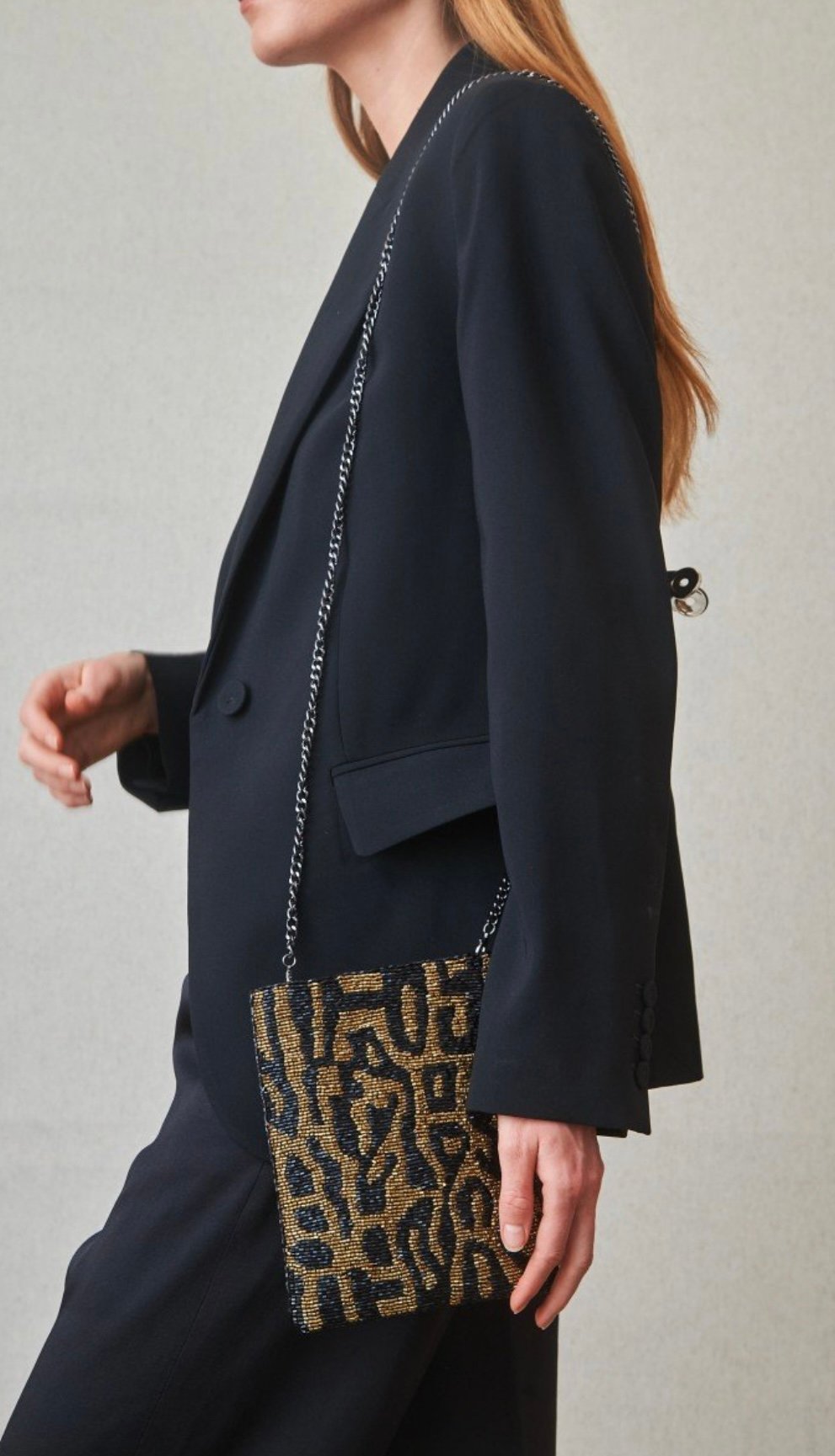 Bolso de fiesta con estampado animal elaborado con cuentas bordadas sobre tejido de algodón. Un diseño llamativo y versátil que añade textura y personalidad a cualquier look nocturno.
