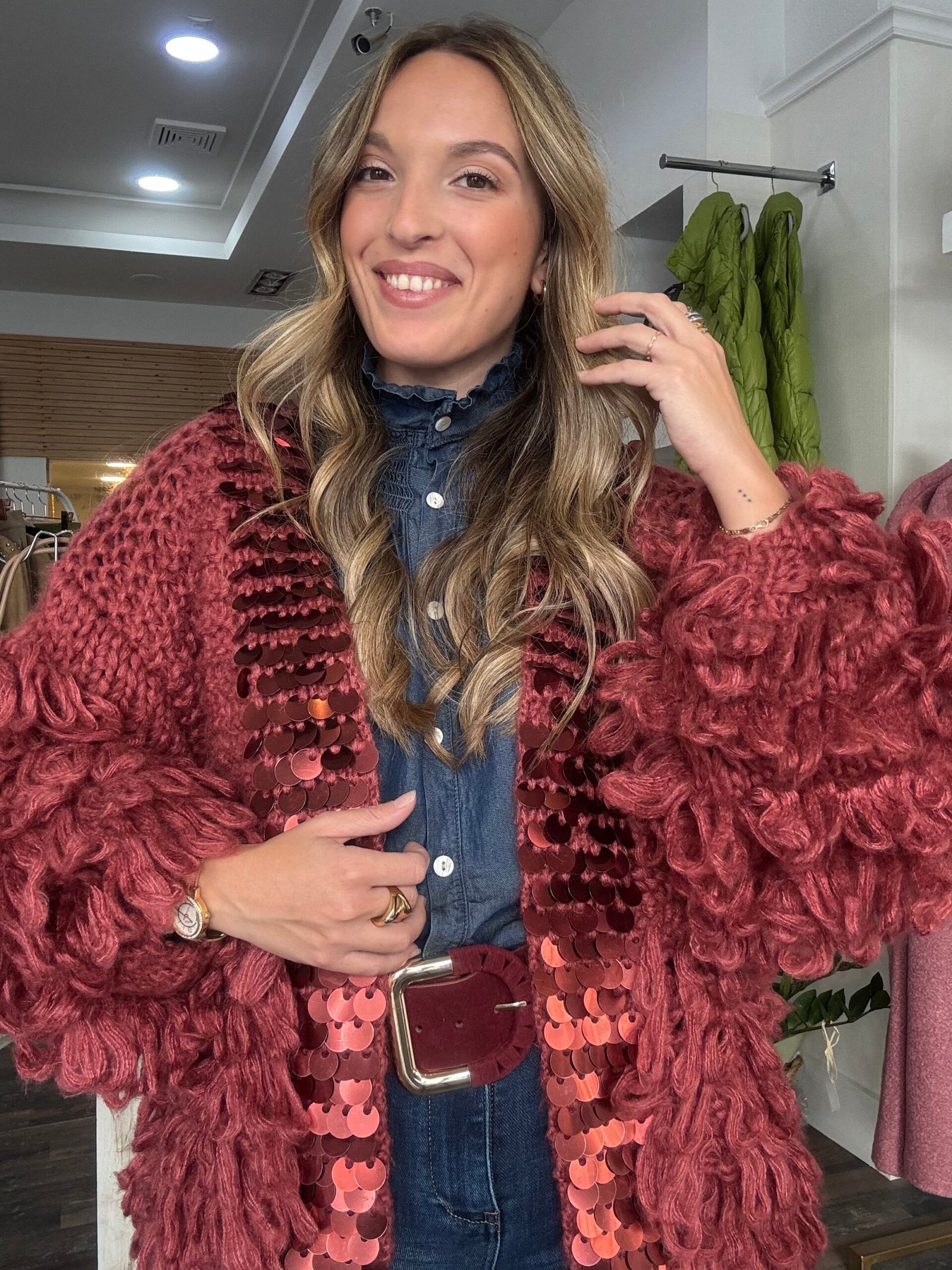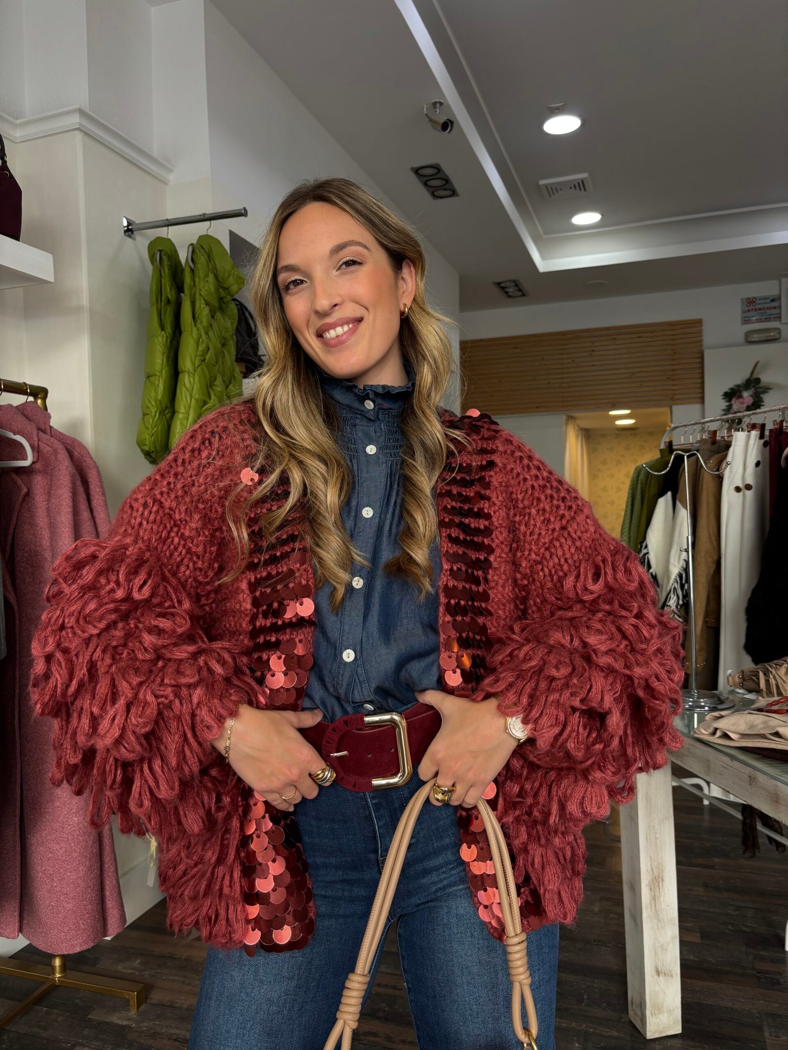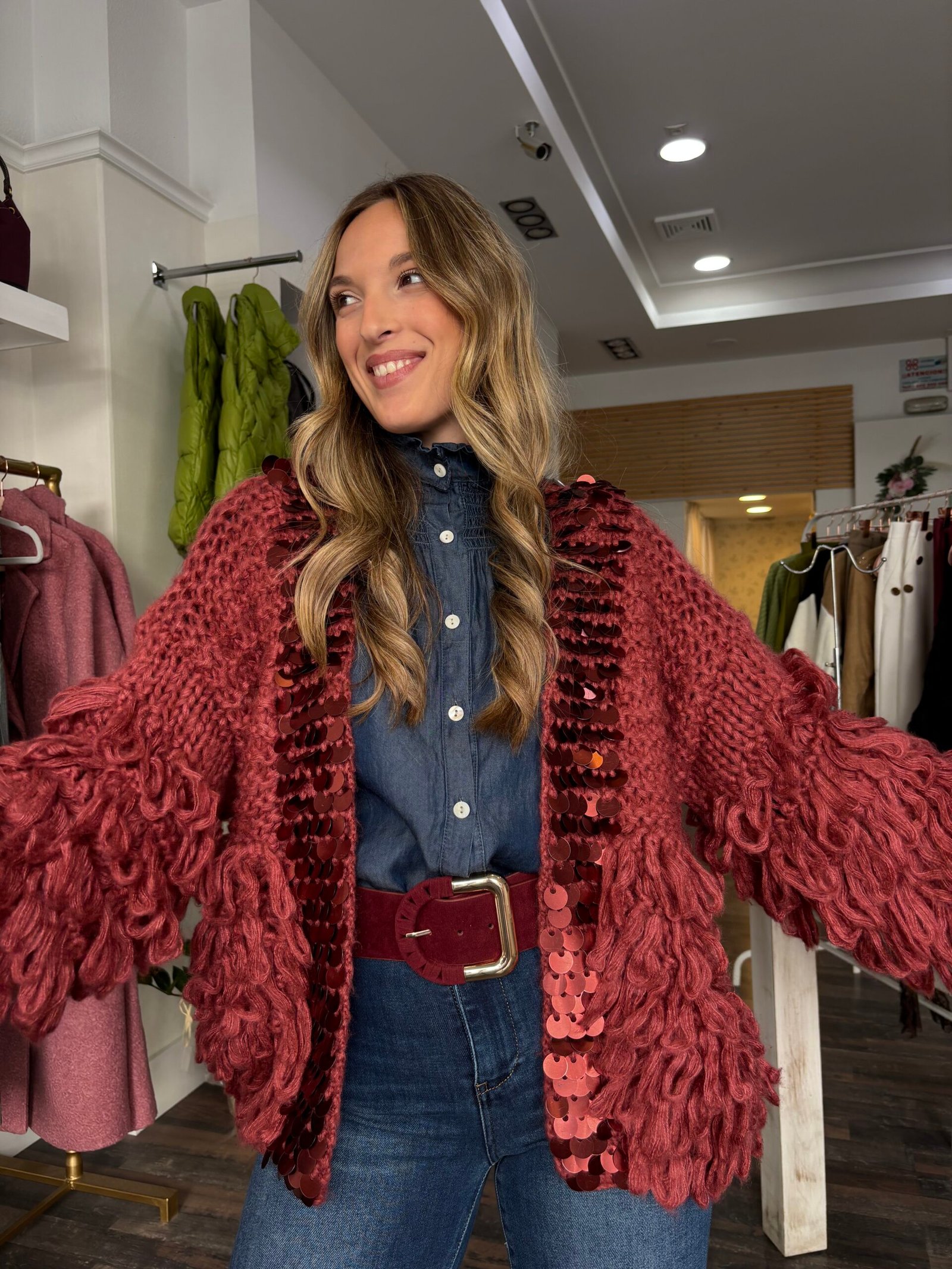 Eleva tu look con nuestro cárdigan de lentejuelas. Un diseño oversize de punto ligero, suave y abrigado.