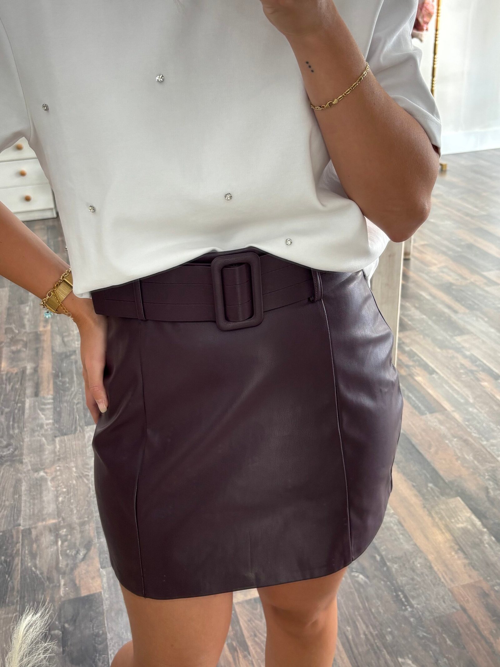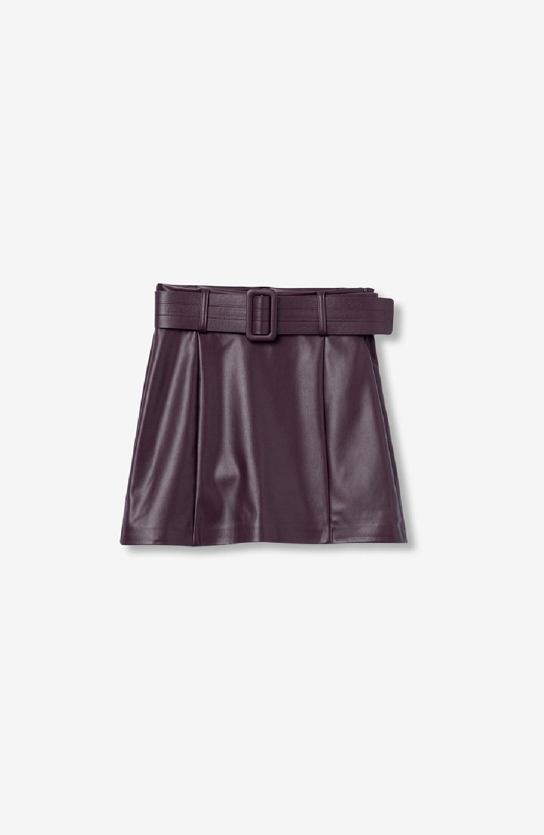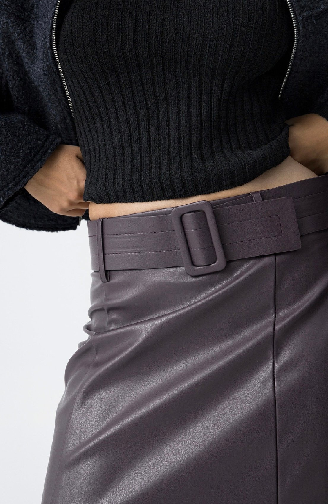 Minifalda efecto piel con cinturón removible y cierre de cremallera lateral. El tejido es un poco elástico.