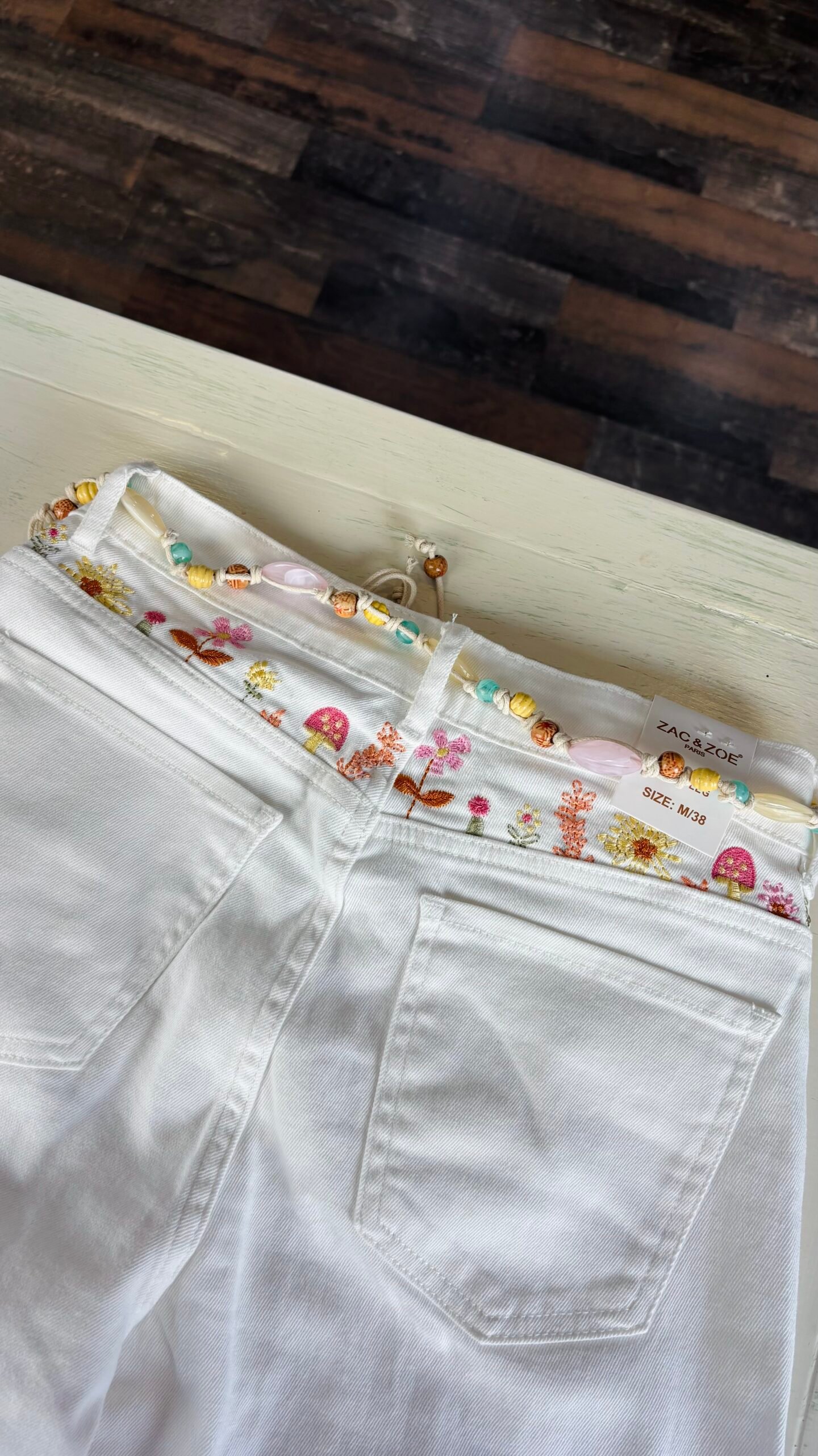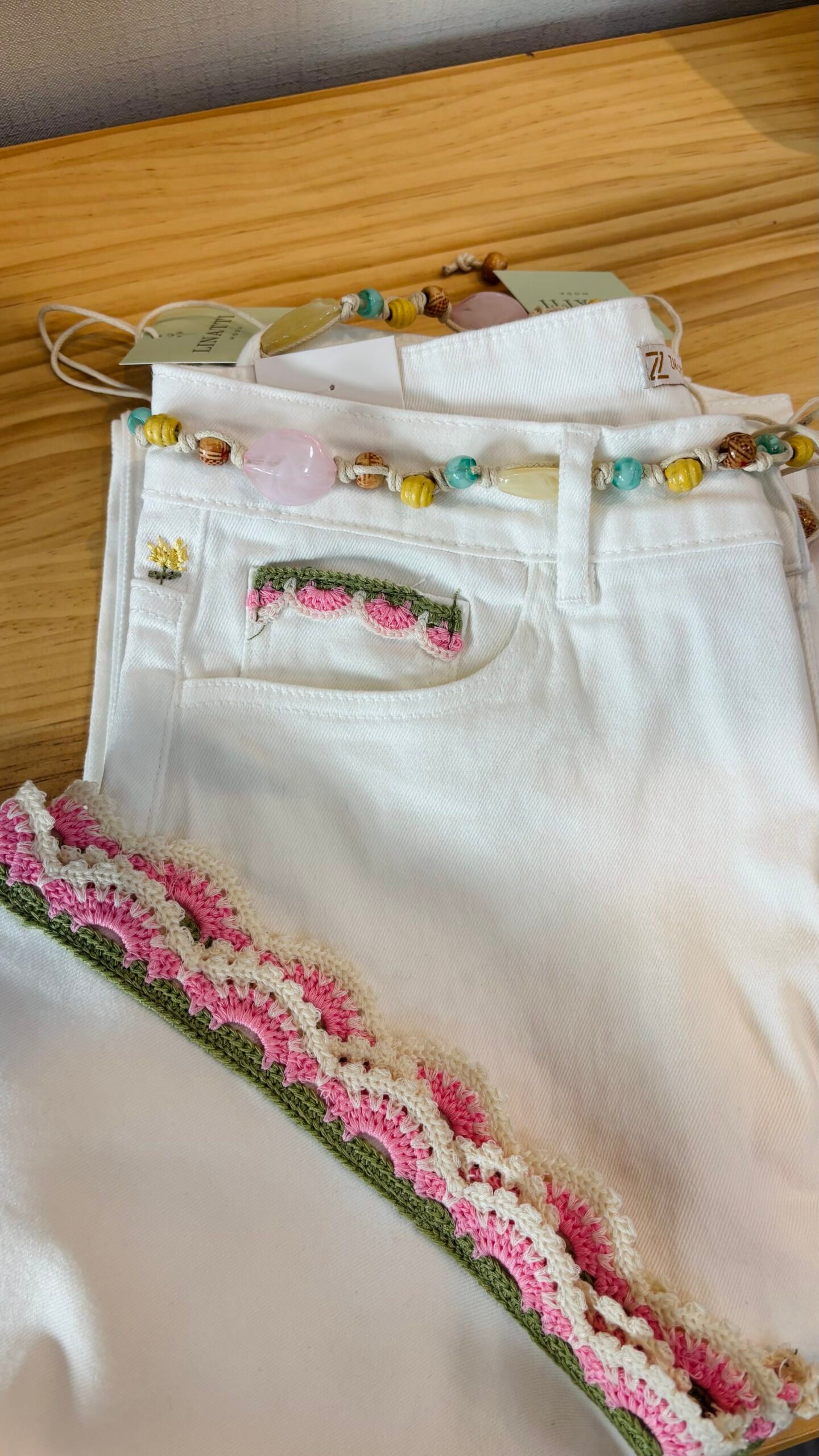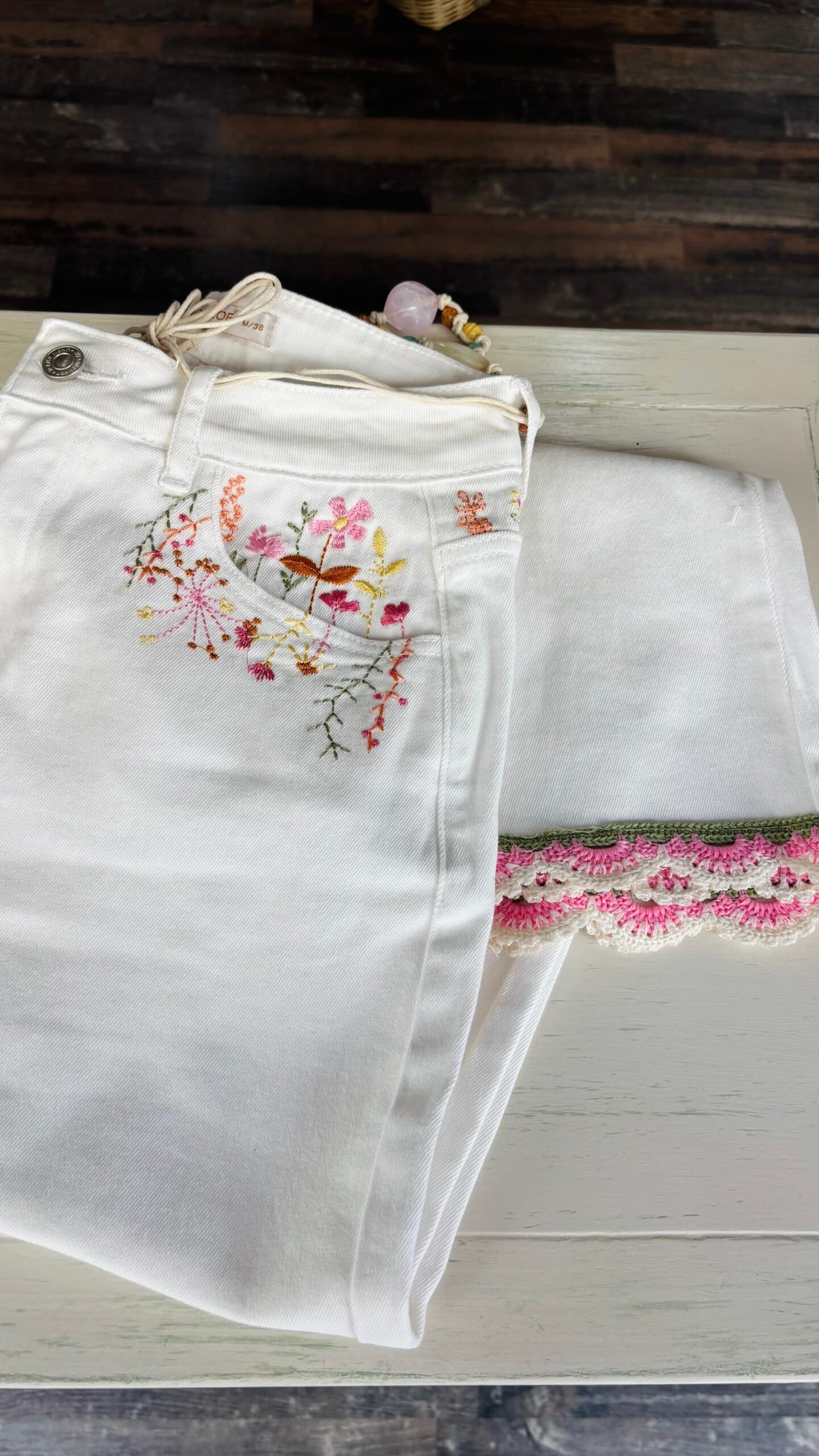 Pantalón vaquero elástico bordado, bajo con punta de croché y cinturón de piedras de colores.